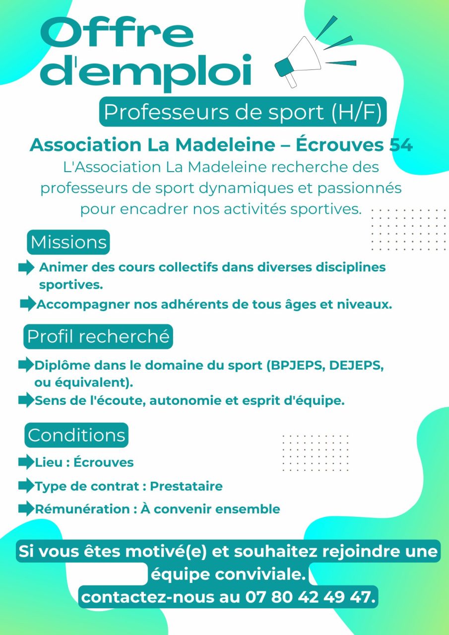 | Emploi | Association La Madeleine | Professeurs de sport | Écrouves | Je télécharge la fiche de poste |