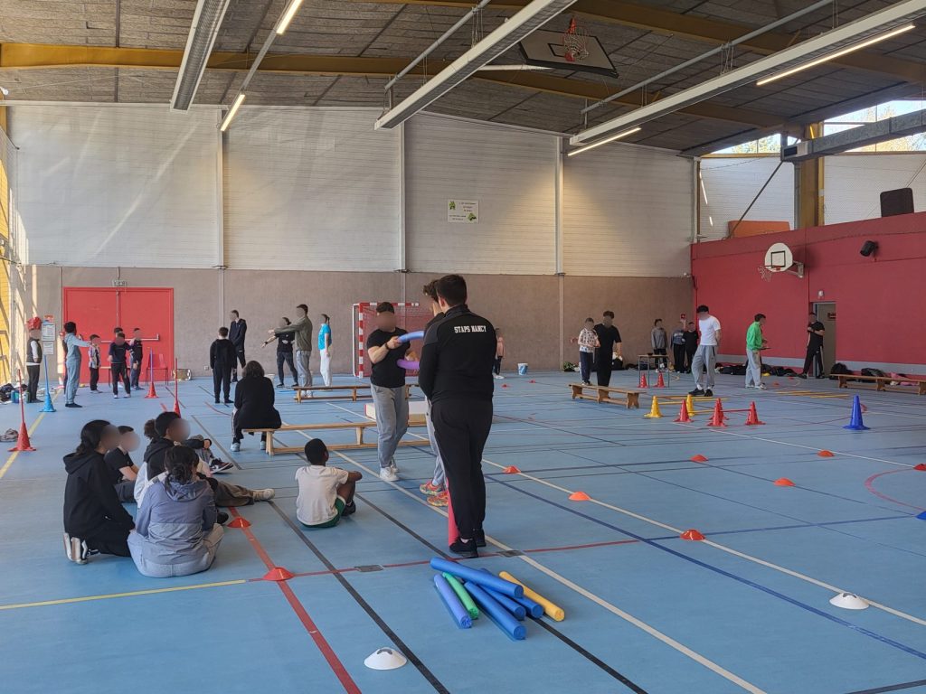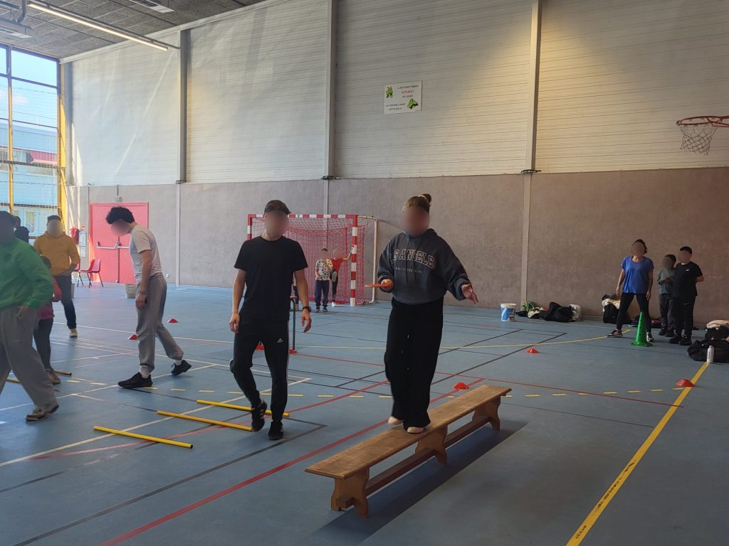 Les élèves ont ensuite pu découvrir, sous forme de rotations, 8 activités physiques et sportives différentes : escrime, parcours de gymnastique, mission collective, torball, mission “sauver la balle”, basket fauteuil, ultimate frisbee et acrosport.